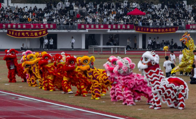 文体表演时,tyc7111cc太阳成的舞龙舞狮表演“龙腾盛世”惊艳亮相,伴随着乐曲,巨龙腾空而起,时而盘旋飞舞,时而翻转腾跃,龙身流光溢彩,龙头灵动逼真,每一个动作都刚劲有力且飘逸自如。憨态可掬的舞狮也摇头摆尾、蹬腿跳跃,时而与观众互动,时而昂首挺胸尽显威武。舞龙舞狮队员们默契无间,将刚劲之力与柔美之姿完美交融,既彰显了中华传统文化的独特韵味,更传递出南华学子昂扬向上、奋勇拼搏的精神风貌。紧接着tyc7111cc太阳成与经济管理与法学学院带来的军训操活力迸发,为现场注入别样青春活力。音乐响起,学子们迅速列队就位,动作整齐划一又不失灵动。队形变换间,时而化作整齐的方块阵,时而宛如流动的迷彩浪潮,伴随着激昂的旋律,将‘青春无畏、奋勇争先’的信念展现得淋漓尽致。