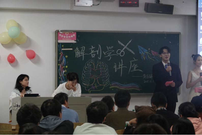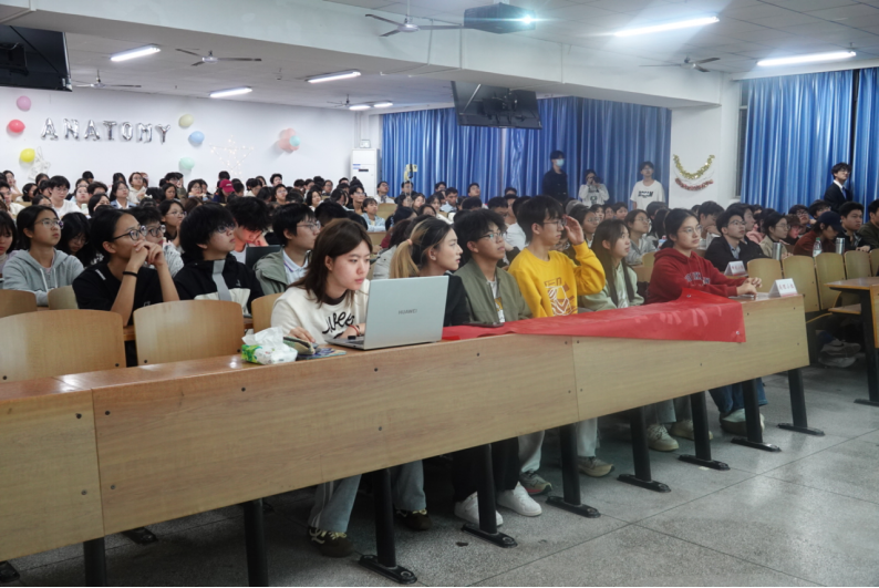 随后的分享环节精彩纷呈。余景煦聚焦女性生产主题,从自然生产与剖宫产的医学原理、临床应用差异展开讲解,尤其针对剖宫产的手术流程、适应症、术后护理等关键内容进行了细致拆解,让新生对妇产科医学知识有了直观认知;陈曦则结合自身大一学习经历,毫无保留地分享了课堂高效学习方法,专业知识梳理策略及各种学习资源,以真实案例引导新生快速适应大学学习节奏;胡烨鹏围绕人体血液循环中的体循环系统,用通俗的语言解析了血液流动路径、核心器官功能及相关疾病关联,夯实了新生的基础医学知识;刘敏则通过对实物的PPT展示与操作讲解,介绍了解剖临床实践中常用器械的使用规范与注意事项,兼具实用性与指导性。