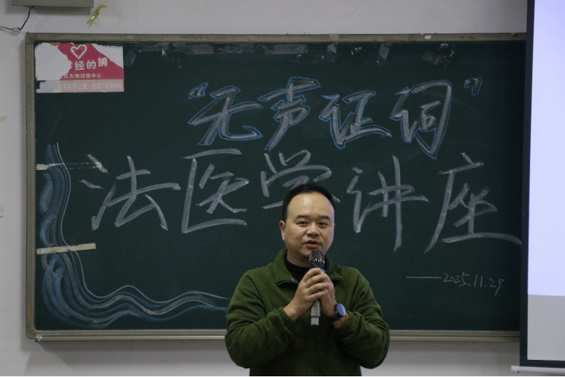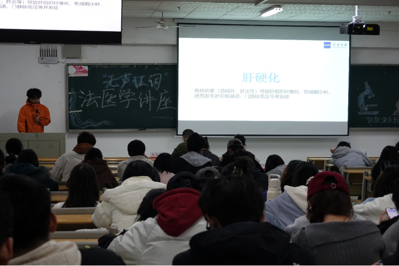 讲座的首个环节,王成昆老师向同学们讲述了病理兴趣小组的历史及其法医学的分支。随后他运用专业而浅显易懂的语言,向同学们阐述了法医学的核心概念,并充分肯定了这场讲座的积极意义。他表示,这既是打破法医学神秘面纱、普及专业知识的重要契机,也能引导青年学子树立科学思维与责任意识。