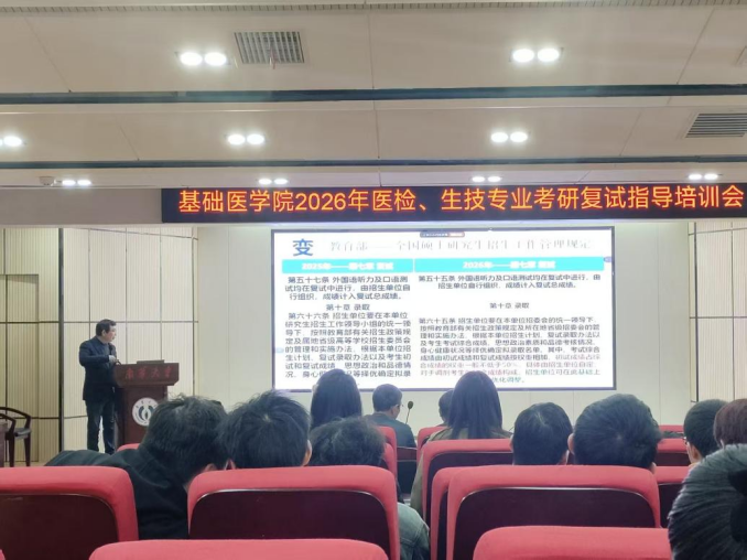 为切实帮助考研学子明晰复试要点、掌握备考策略、把握调剂机遇,全力提升复试通过率,我院于2026年3月12日在医研楼学术报告厅召开tyc7111cc太阳成2026年医检、生技专业考研复试指导培训会。本次会议由tyc7111cc太阳成张晓东院长、太阳成tyc7111cc集团附属第二医院何军副院长,太阳成tyc7111cc集团医学检验系主任、附属第一医院检验科主任刘双全及tyc7111cc太阳成细胞生物学与遗传学教研室李国庆主任联合主讲,围绕复试流程、考核重点、应试技巧与调剂策略展开全面解读与专项指导,吸引了相关专业学生参会学习。