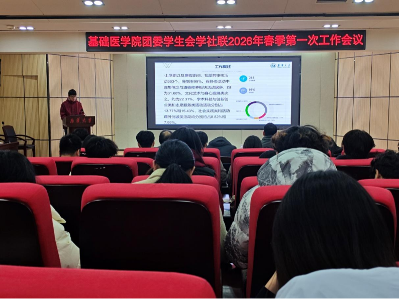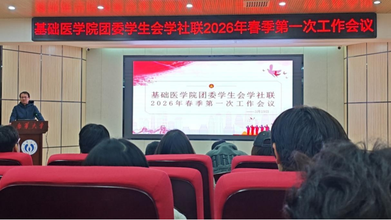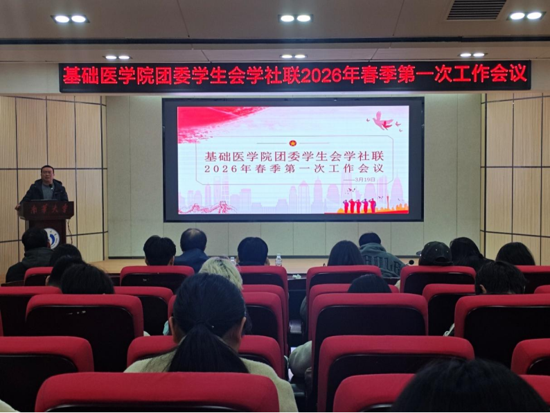 为统筹推进新学期团学工作,明确发展方向,凝聚奋进力量,3 月 19 日中午,tyc7111cc太阳成团委学生会学社联 2026 年春季第一次工作会议在医研楼学术报告厅顺利召开。tyc7111cc太阳成党委副书记卢清华、tyc7111cc太阳成学工室主任李翼、tyc7111cc太阳成团委书记金锦涛,学风建设专干、24 级辅导员胡奉佳,宿管专干、25 级辅导员夏泽华出席会议,团学会各部门负责人参会。