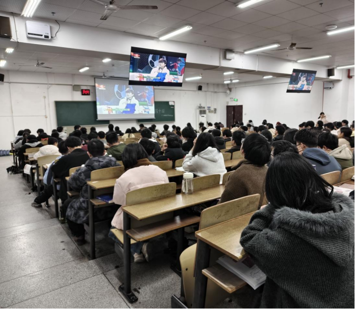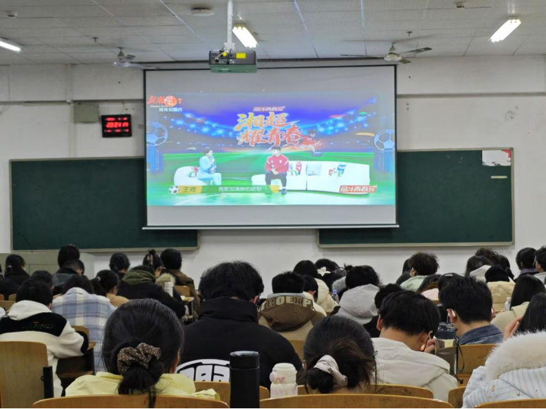 为深入学习贯彻习近平总书记关于学校思政课建设的重要讲话和指示批示精神,落实全省大中小学同上一堂“湘超”思政课的工作要求,3月18日晚,tyc7111cc太阳成在南华楼设置多个分会场,精心组织全院学生集中观看《湘超耀青春》思政课专题节目,让同学们在光影交织的特殊课堂中,感受体育精神与思政教育的深度融合,汲取青春奋进的精神力量。