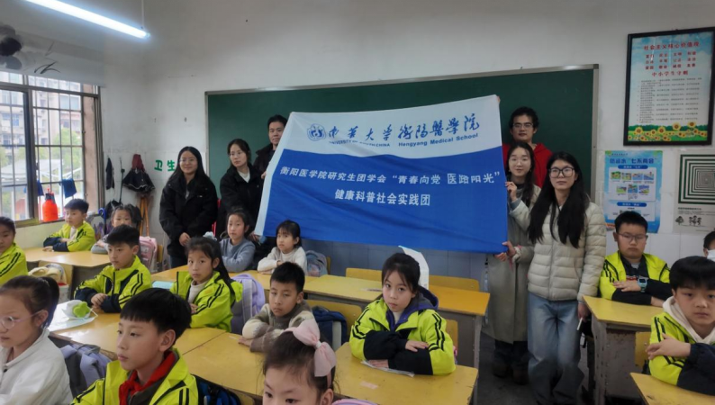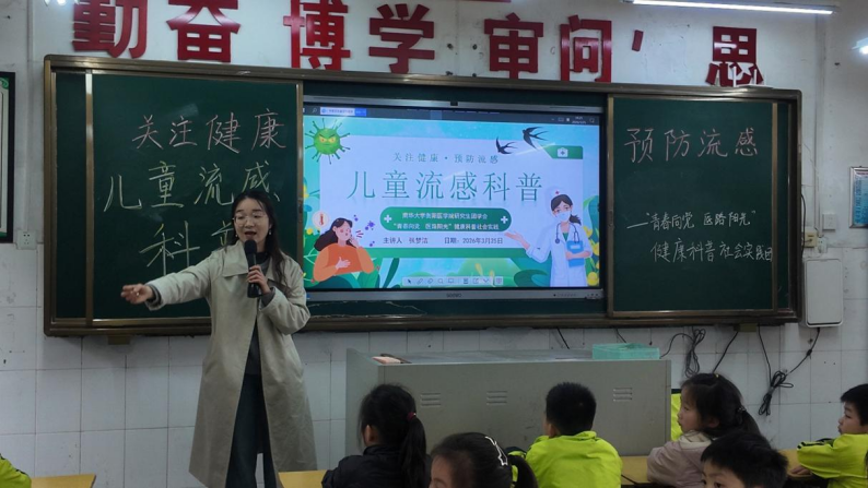 为弘扬和践行雷锋精神,助力健康湖南,2026年3月25日 ,太阳成tyc7111cc集团衡阳医学院研究生团学会“青春向党 医路阳光”健康科普社会实践团走进蒸湘区实验小学三(2)班,开展儿童流感科普专题活动,把专业的流感防护知识变成通俗易懂的趣味讲解,为孩子们的健康成长筑牢“防护墙”。