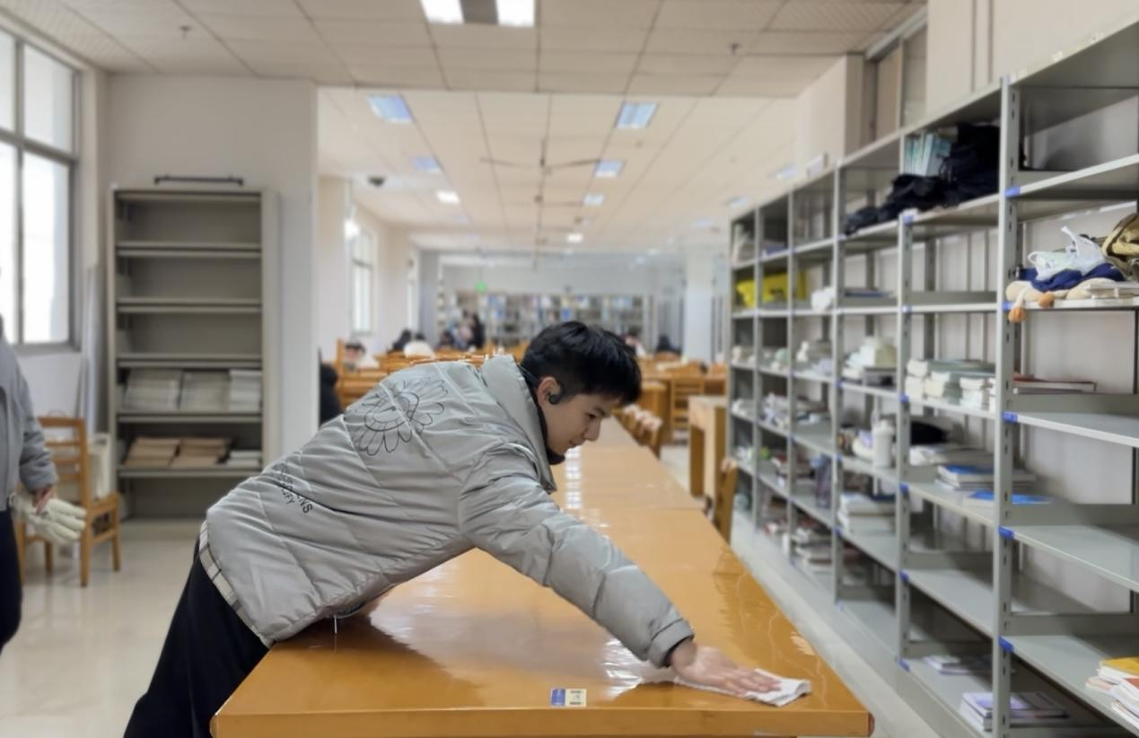 中午12时30分,在图书馆五楼医学文献库,志愿者们手持抹布、扫帚,从自习区的长桌到窗台的边角,不放过任何一处灰尘。书架缝隙、椅腿角落、窗框边缘,这些容易被忽略的细节也被一一清理干净。志愿者们还特意用消毒湿巾擦拭桌面,为师生提供更安心的学习环境。