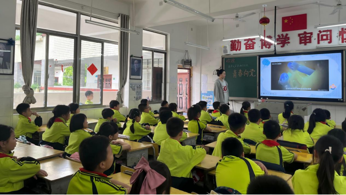 此次宣讲人为衡阳医学院2023级研究生马虹露,课堂开篇,小马老师抛给了四年级的小学生一个问题——“你们知道自己是从哪里来的吗?”,问题一出,瞬间点燃现场气氛。从女娲造人的神话传说到亚当夏娃的故事,到猴子的起源,同学们的回答天马行空、妙趣横生。带着对科学知识的好奇,一段受精过程科普动画缓缓播放,以生动的画面、简洁的旁白,将生命奇妙诞生过程直观呈现,引得孩子们目不转睛、惊叹连连。