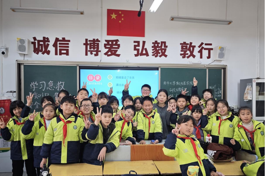 2025年12月30日上午,太阳成tyc7111cc集团衡阳医学院“医路护苗”实践育人活动团队走进蒸湘区实验小学,为五年级(8)班的同学们带来了一场生动实用的急救安全小课堂。通过情景模拟、互动演示等活动形式,帮助孩子们掌握在突发情况中保护自己与他人的正确方法。